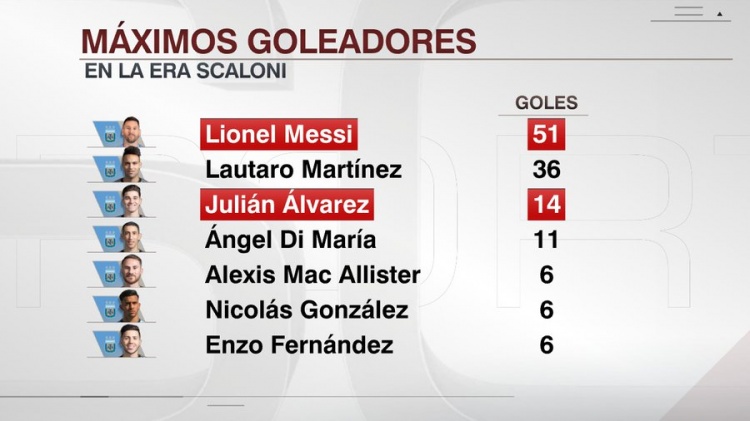 LeyuSports-斯卡洛尼执教下阿根廷队进球榜:梅西51球第一,阿尔瓦雷斯第三